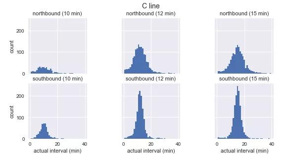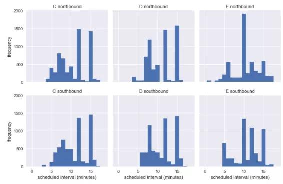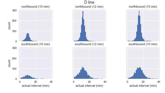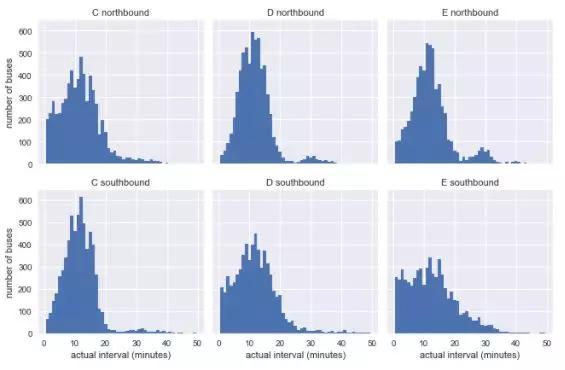 我们看到,每条路线和时间表的观测到达间隔的分布接近高斯分布,在预定的到达间隔附近达到峰值,并且在路线开始附近具有较小的标准差(C的南行(southbound),D / E的北行(northbound)),以及在路线结束附近有更大的标准差。