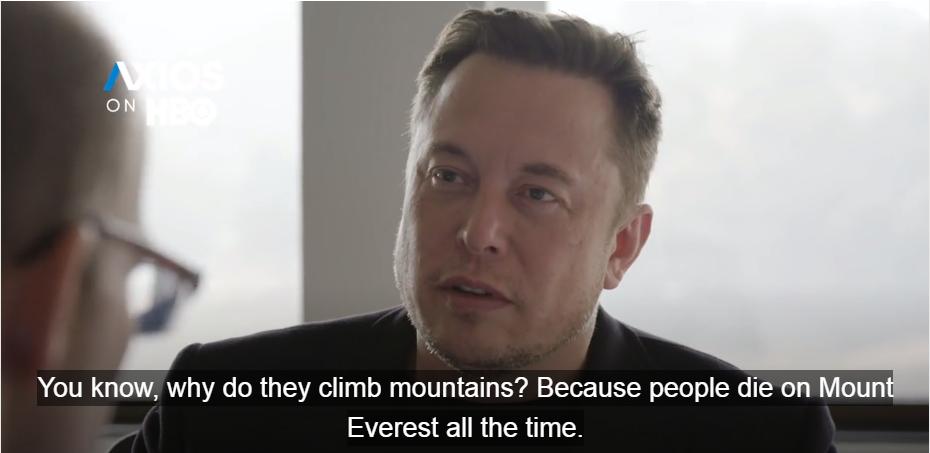 尽管如此,马斯克依然坚持推广multiplanetary(跨星球)的未来生存愿景,他在访问中只差没有原文引用登陆珠峰的著名句子(为什么登?因为山就在那儿):