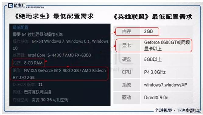 去年3月份开始,《绝地求生》这些吃鸡类游戏突然热门起来。常玩端游的朋友应该也知道,上一个全球大热的端游是英雄联盟,但英雄联盟一般玩家并不需要太好的GPU显卡。而《绝地求生》这种大型3D游戏实时建模数据多,要求的计算能力很高;而且蓝洞(开发公司)对于《绝地求生》的优化也做的一般,导致《绝地求生》对于GPU的要求整体比英雄联盟高了一个档次。同为网游,《绝地求生》最低配置也得要中高端显卡,而英雄联盟入门级显卡即可,差距太大。