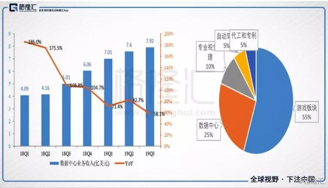 各个公司的海量数据需要数据中心来处理,而数据中心的计算能力就由GPU来提供。英伟达数据中心业务这几年成长的很不错,现在已经是英伟达第二大业务,但是的确能看到每年营收增速在缓慢下滑,这一季度数据中心营收增速58.1%,是这几年最低的增速。而游戏增速也创下这两年新低,营收增长只有13%。另外英伟达还有一个逻辑,如果汽车走向自动驾驶,其数据处理能力必须极强,但是这块业务体量还是太小,营收占比5%,Q3的增速也只有19%,