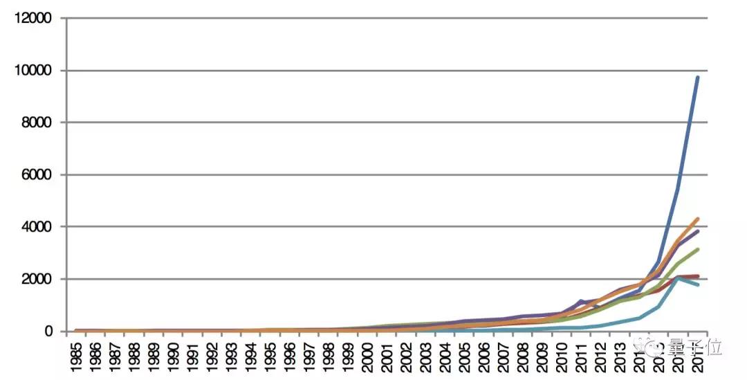 更进一步的申请量趋势上,机器学习算法在2010年后增速最快,并在2014年之后一枝独秀。