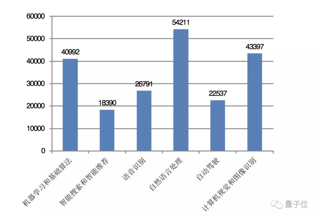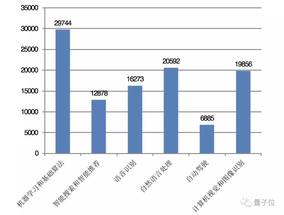 中国国内的各技术分支专利申请量,机器学习和算法则明显多于其他领域: