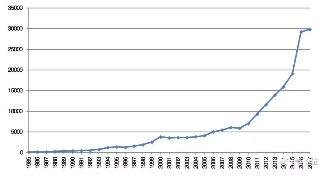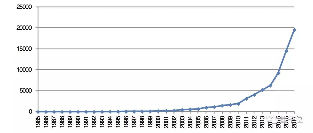 先从趋势谈起,按照专利申请年份,统计了从1985年至2017年的各年度专利申请量变化情况。