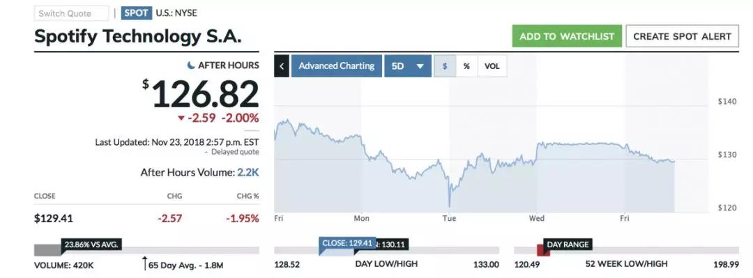 2018年4月,流媒体音乐平台Spotify在万众瞩目中上市了,之后曾达到过每股198.99美元的高位。然而近几个月来,Spotify的股价开始持续走低,并于11月20日,跌到了上市后的最低谷:120.49美元。