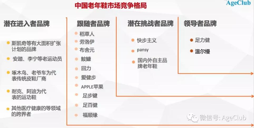 根据AgeClub研究中心对市场的走访调研,我们认为潜在挑战者,特别是国内传统鞋服巨头2019年会开始发力进入老年鞋市场,这些企业拥有品牌、渠道和供应链的优势,将会改变整个市场格局。
