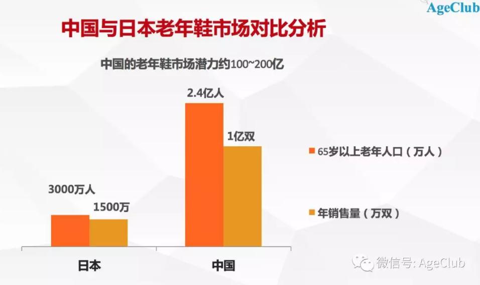 对比日本老年鞋目前30亿左右的销售额,结合中国老龄化现状,对中国老年鞋市场规模进行计算:按照目前平均每位中国老人一年购买0.7双鞋,客单价150元/双,考虑城乡二元结构的差别,老年鞋完成市场教育之后销售数量将达到1亿双,市场规模在100~200亿级之间,是日本老年鞋市场规模的3~5倍。