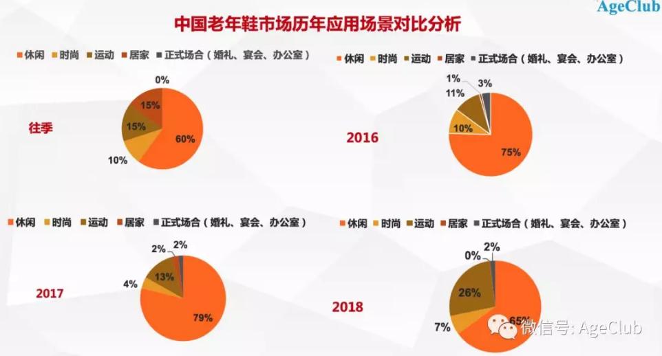 从老年鞋的应用场景分析,除了传统的休闲与运动两大应用场景外,2016年出现了时尚这个应用场景细分,并且每年都有稳定增幅,银发族追求时尚个性化的穿戴需求在逐步释放潜力。