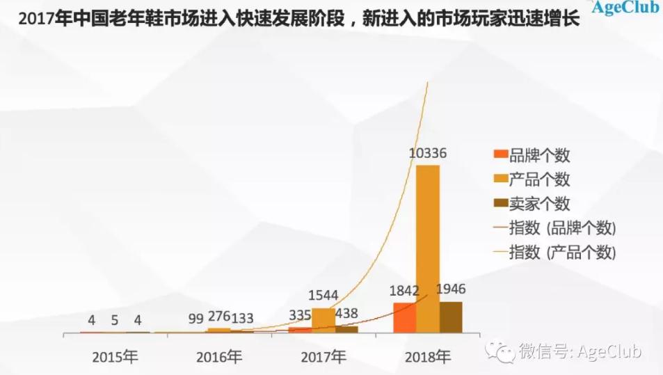 Ageclub研究中心整理了近四年的老年鞋市场数据,统计了1800多个品牌的老年鞋,从上市时间、卖家数量、品牌数量、新增品类数量、价格区间四个维度分析,可以明显看到最近四年从产品个数到卖家数量、品牌数量都有惊人的增长。大量新玩家在看到足力健的成功模式之后涌入市场。