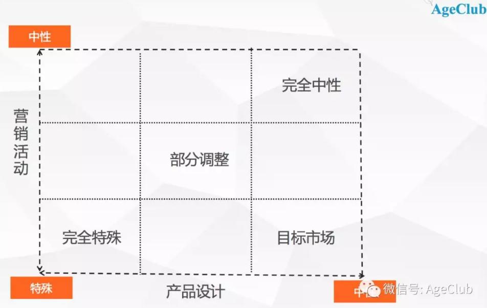 产品越靠近左下角越表示这个产品在设计和营销策划上越要专门面向老年人群,比如养老机构、老年金融产品;越靠近右上角完全中性区域表示,产品在设计和营销上就越属于通用产品,各个年龄段都可以购买,属于泛年龄产品,比如白色家电、旅行服务、汽车等。