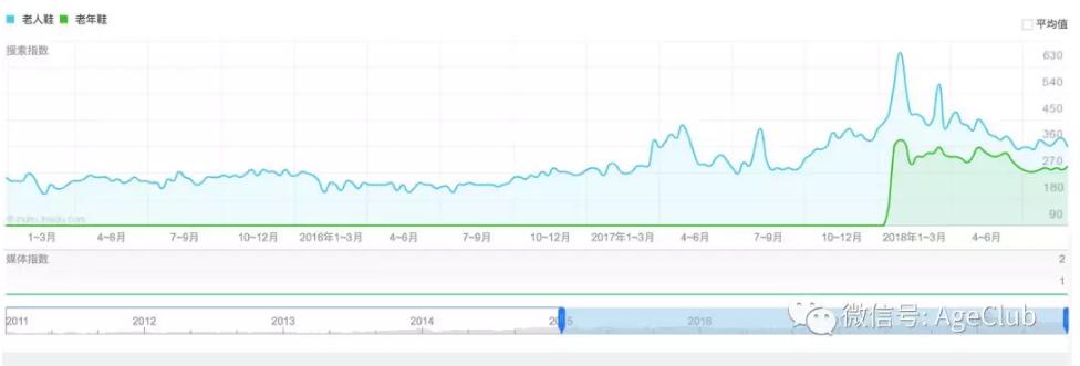 从数据变化趋势可以看到,2017年10-12月份之后,用户检索这两个关键词的数量有了大幅飙升,这与2017年下半年大量企业切入老年鞋市场,在电视报刊等媒体以及互联网上大规模打广告有直接关系。