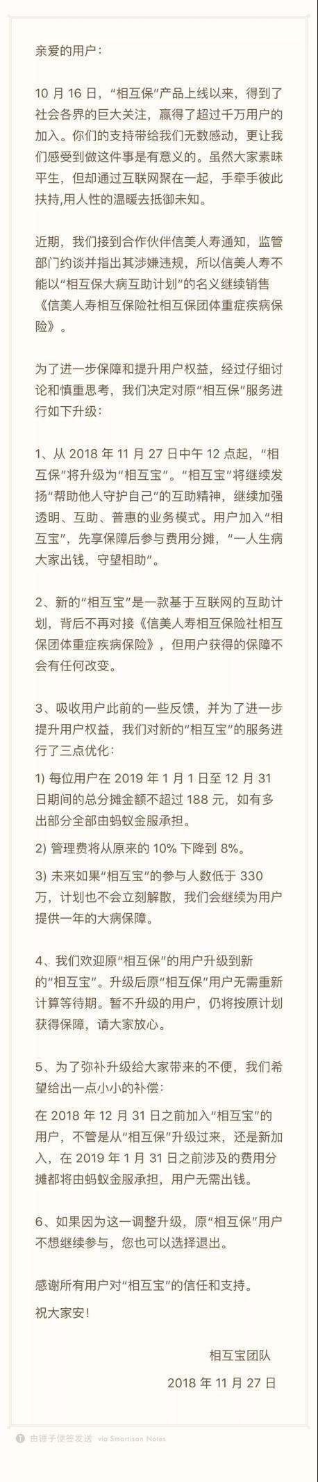 11月27日上午,蚂蚁金服发布公告称,自当日中午12点起,相互保将升级为“相互宝”,定位为一款基于互联网的互助计划。