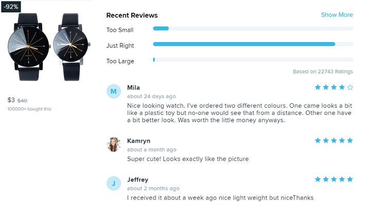 评论是不是刷出来的呢?从YouTube平台各大博主对Wish的测评视频来看,这个电商平台十分火爆,视频量与播放量都很高。而这些博主对Wish最多的评价就是「Nice!」(好)、「majorly majorly cheap!」(非常便宜啊!)。的确,Wish就是靠便宜出道的,但是这一点也不影响欧美人民对它的喜爱之情。要是不喜欢买到的产品或者不合适的话,平台还给你免费!退款!无需退货。这叫人如何不爱?