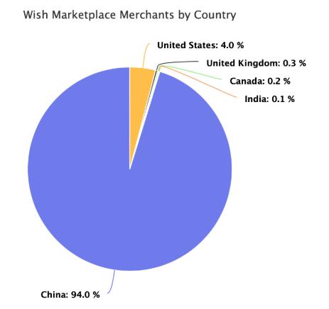 (Wish平台上的卖家,94%来自中国,4%来自美国,剩下的来自英国、加拿大及印度,来源:MarketplacePluse)