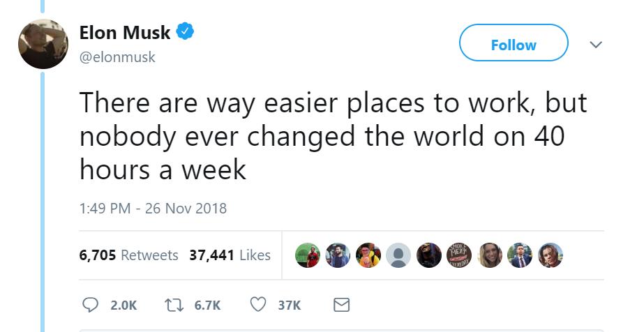 11月26日,马斯克发推特表示,“工作可以变得更加容易,但从来没有人能在每周工作40小时的情况下改变世界。”