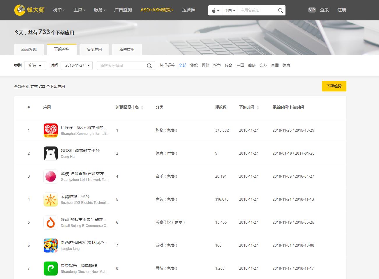 大数据分析平台蝉大师统计显示,截至11月27日下午16时,苹果当日共暂停了733个中国区App的下载。