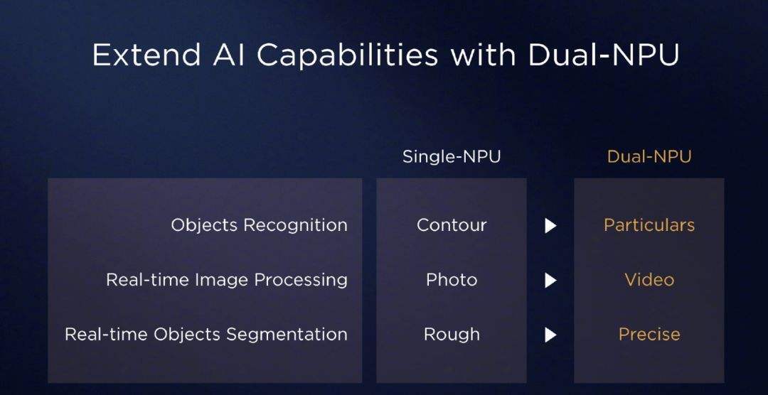 不同于高通、三星以单核为主,而是可扩充,实现单核到多核的人工智慧处理单元。要知道,未来手机上人工智能的操作只会越来越多,单核心肯定不够用,双核甚至四核是迟早的问题,早点上双核,实际上是在早做准备。