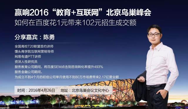 上面是我在鸟巢峰会做分享时主办方做的海报,海报的标题“如何咱百度花一云带来102元招生成交额”就是陈勇六要素中的喜好,海报中关于我的各种title就是陈勇六要素中的权威。