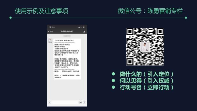 很多公司都有微信公众号,但他们的问题是公众号不知道发什么,公众号的欢迎语也没做好,所以导致最后公众号运营也没做好,我给大家一个模板,微信公众号的欢迎语上一定要用到陈勇六要素中的权威和行动号召,拿我自己的微信公众号:陈勇营销专栏举例