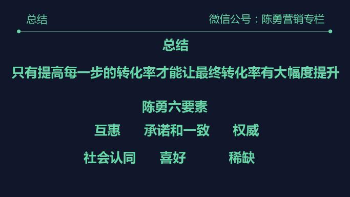 总结一下,只有提高每一步的转化率才能让最终转化率有大幅度的提升,还有就是我们今天讲的陈勇六要素:互惠、承诺和一致、权威、社会认同、喜好、稀缺。
