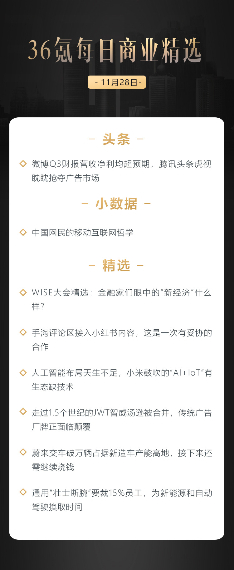 本文来自36氪付费栏目《36氪每日商业精选》——11月28日