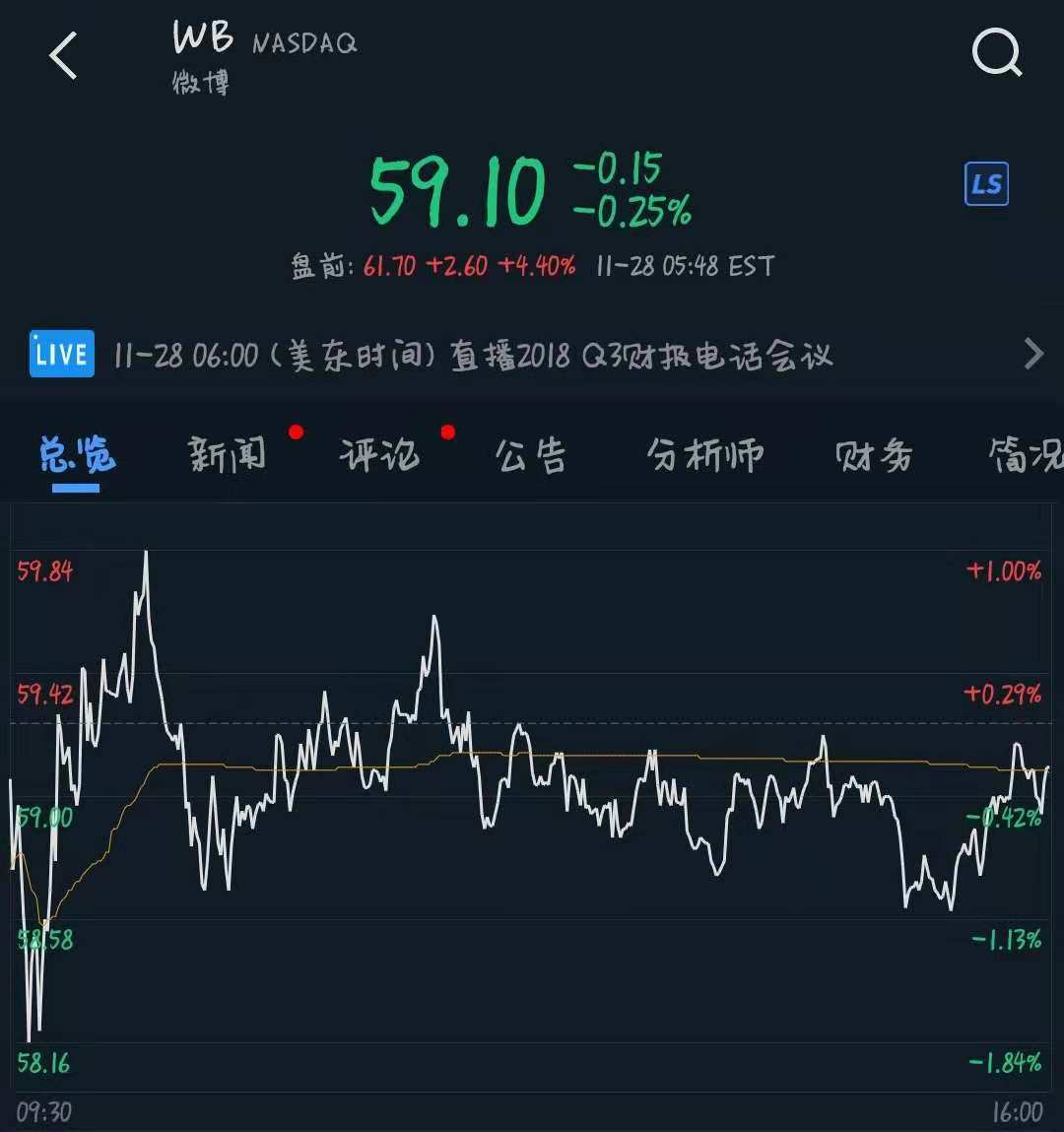 截至发稿,微博盘前股价为61.70美元,涨4.40%。