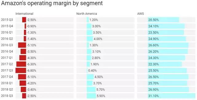 亚马逊云计算(AWS)的利润增长提升亚马逊的利润,尽管截至2017年AWS收入总占比仅为10%,但能产生一半以上的公司现金流。