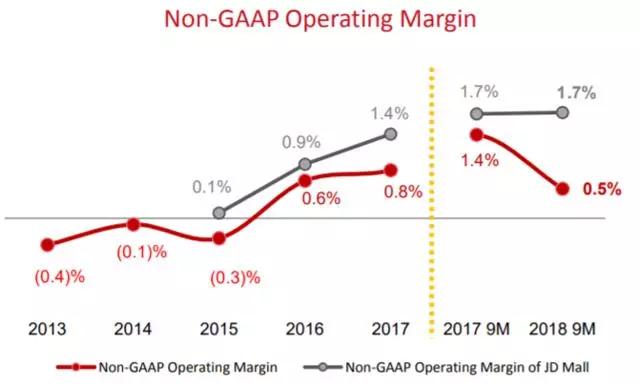 同时,亚马逊近几个季度在零售业务中取得成功,北美市场今年三季度的营业利润率接近6%,而京东商城NON-GAAP的运营利润率仅为1.7%,公司整体的NON-GAAP运营利润率仅为0.5%。
