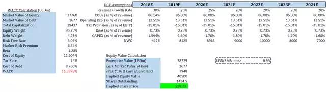 下图是笔者提供的一个简单基本案例估值,假设条件包括未来七年公司营收增速减少至20%,与亚马逊相似,以及未来几年因为物流网络建设导致资本支出略有上升,同时参考行业终端价值的估值。