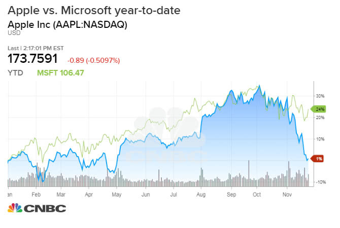 即使微软超越了苹果,这家软件公司也没有苹果那样的市场影响力。苹果公司影响着市场情绪,并以科技行业的龙头股进行交易。自10月1日以来,苹果股价已下跌22.8%,而微软同期仅下跌6.3%。