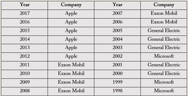 自1925年以来,仅有11家公司市值位列过第一。根据标准普尔·道琼斯的数据,AT&T,其前身是Ma Bell,将最有价值公司这一头衔保留了59年,而IBM在21年的时间里市值排名第一。在本世纪头十年中期,埃克森美孚是几年来最大的公司。