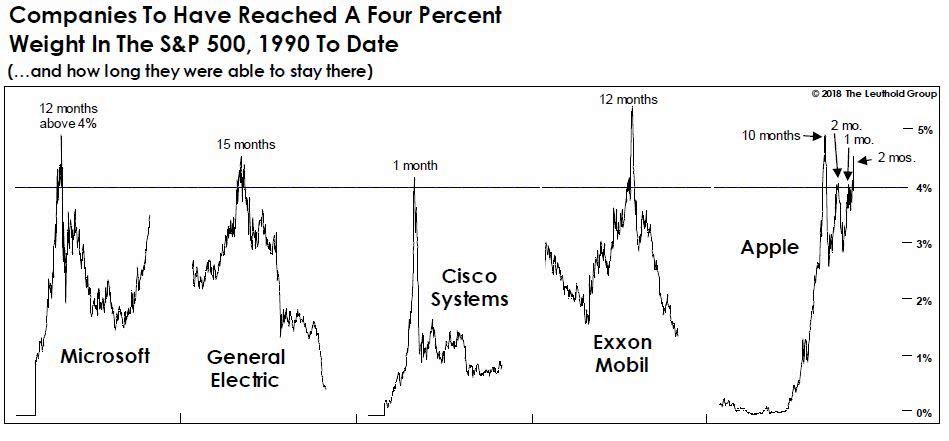 市场研究公司Leuthold Group研究了那些被称为“4%俱乐部”的公司股票,也就是那些拥有在标准普尔指数中所占比例超过4%的公司。他们指出,上一次微软是市值最大公司时占据了4%的市场份额,通用电气和思科也是如此,这是不同寻常的力量整合。