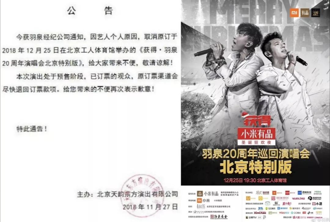 从“羽泉20周年巡回演唱会北京特别版”承办方天韵东方的声明可见,就在昨天(11月27日)该公司就签署了宣布原定于12月25日在工体体育馆举办的演唱会取消的声明。