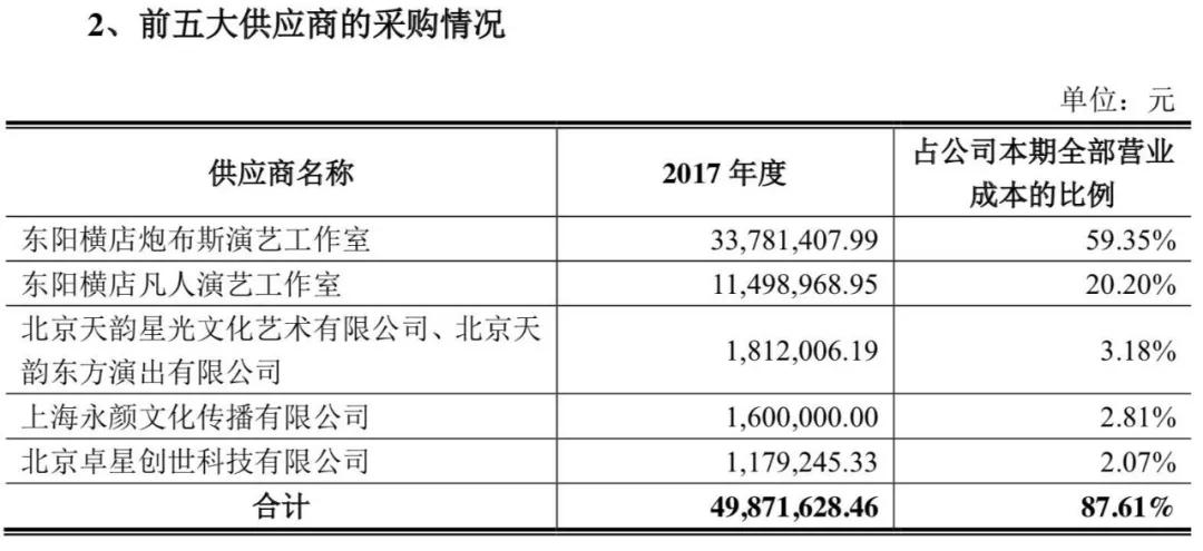 过去两年,巨匠的前两大供应商为东阳横店炮布斯演艺工作室即胡海泉个人工作室,和东阳横店凡人演艺工作室即陈涛(陈羽凡)的个人工作室。2017年,炮布斯演艺工作室的采购额为3378万元,占当期营业成本比例59.35%;凡人演艺工作室的采购额为1149万元,占当期营业成本比例20.20%,两者合计占比达79.55%。