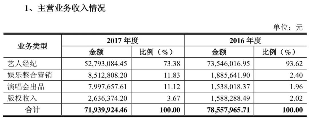 根据公转书的说明,艺人经纪为巨匠文化的核心业务,2016年、2017年这项业务营收分别为7354.6万元、5279.31万元,占总营收的93.62%、73.38%。不过巨匠实际签约的艺人除了“羽泉”二人,其他也只有李晨(主持人)、新声一班和琥珀三人。