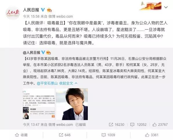 今日(11月28日),北京市公安局石景山分局官方微博“平安石景山”发布通报,称根据群众举报,在本市某小区抓获2名涉毒违法人员陈某(男,43岁,歌手)和何某某(女,25岁,无业),现场起获冰毒7.96克、大麻2.14克。经尿检,陈某呈冰毒类和大麻类阳性,何某某呈大麻类阳性。目前,陈某因吸毒、非法持有毒品,何某某因吸毒均被行政拘留。