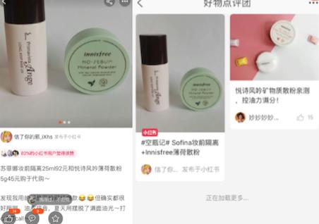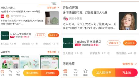 在手淘首页搜索“悦诗风吟”,其中“纤巧精细睫毛膏”、“矿物质散粉”等产品页面下方会出现一个名为“好物点评团”的板块。点开特定产品页面,在下方能看到一个带有小红书logo的点评,点进去后可查看产品具体信息,以及小红书达人的点评。