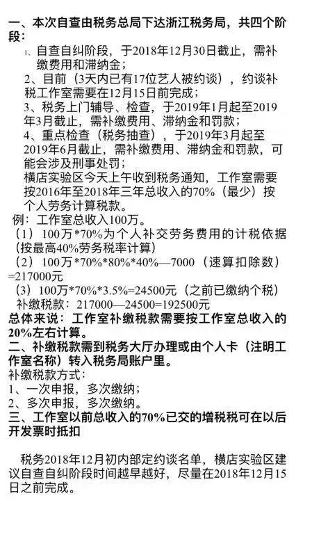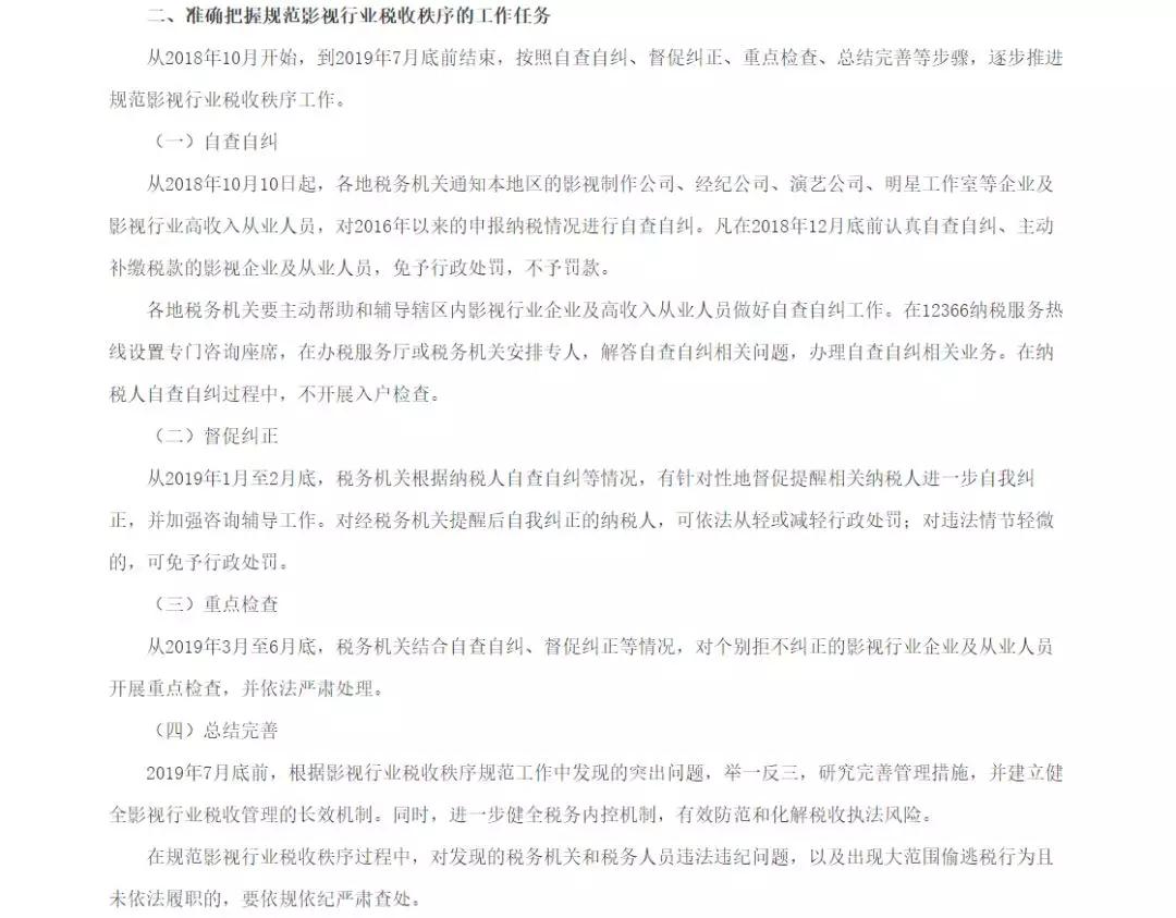 《通知》规定,从2018年10月开始,到2019年7月底前结束,各影视制作公司、经纪公司、演艺公司、明星工作室等企业及影视行业高收入从业人员,需要“按照自查自纠、督促纠正、重点检查、总结完善等步骤,逐步推进规范影视行业税收秩序工作。相关公司需对2016年以来,过去三年间的申报纳税情况进行自查自纠,凡在2018年12月底前认真自查自纠、主动补缴税款的公司及相关人员,将免予行政处罚,不予罚款。随后税务部门还将于明年1月至2月底、3月至6月底,分别对相关公司及个人展开督促纠正与重点检查,并依照情节严重程度进行处罚。”不过,当时的政策主要针对偷漏税的企业与工作室,且未具体提及补税比例。