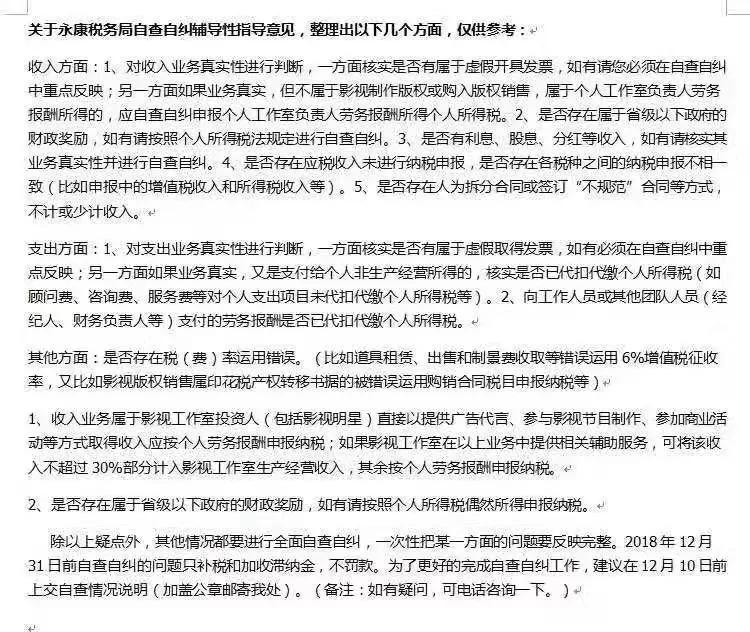 最主要的原因,可能在于原本《通知》里的自查自纠主要针对偷税漏税等行为,很多企业和公司可能没有对此报以足够的重视。而当下除了继续打击偷税漏税,部分地区也涉及到了优惠政策的调整。有业内人士坦言:“很多工作室之所以会兴起都是和当地的一些扶持政策有关,如果采取一刀切的补税模式把之前的优惠也收回去,有的企业觉得难以接受。”