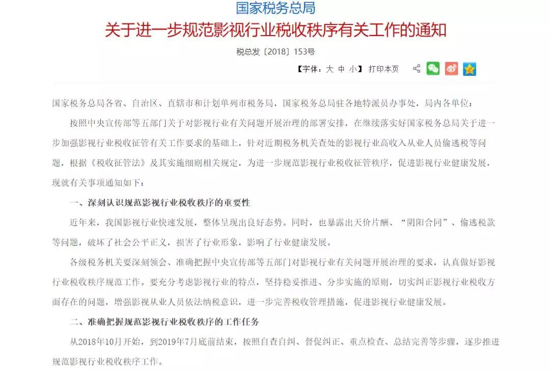 若如北京、江浙地区的税务部门所言,仅仅只是开展自纠自查工作,并没对补缴的比例、税率等下达明确文件的话,那此次在网上引发热议的税收政策并非是所谓“税收新政”,而是10月初国家税务总局下达的《关于进一步规范影视行业税收秩序有关工作的通知》(以下简称“通知”)的具体落实。