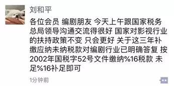 不过就在下午,著名编剧刘和平发布朋友圈称,在与国家税务总局领导沟通后确认,“国家对影视行业的扶持政策不变”,其中针对编剧行业的补税方案已经有了明确答复:“按2002年国税字52号文件缴纳16%税款,未足16%补足即可。”若此消息属实,至少编剧们可以松一口气了。