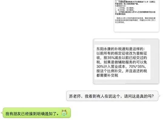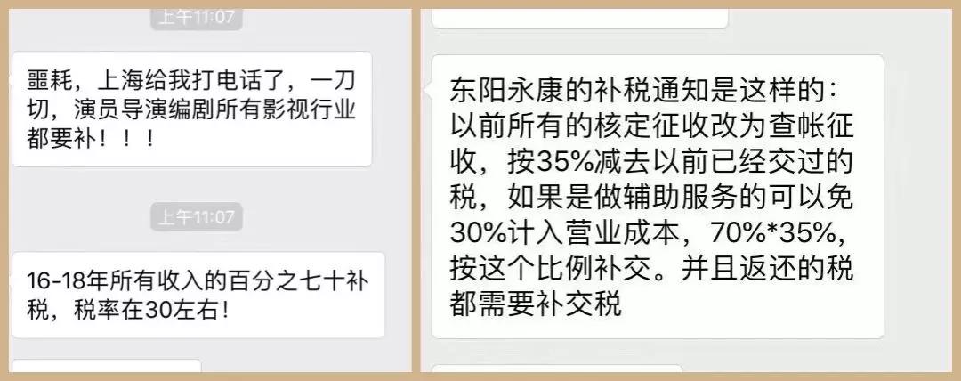 而所有这一切恐慌的根源,都来自于今早起在网络上广泛流传的三张截图:一份“税务总局下达浙江总局”的文件显示,当地改核定征收为查账征收,从业者需要按照过去三年收入的70%(最少),按个人劳务来补缴税款;某上海从业者亦在微信群里表示,上海地区要按照70%的税基和30%的税率来征税;东阳永康方面传出的消息则为按照35%的税率补缴,做辅助服务的可以免30%计入营业成本。