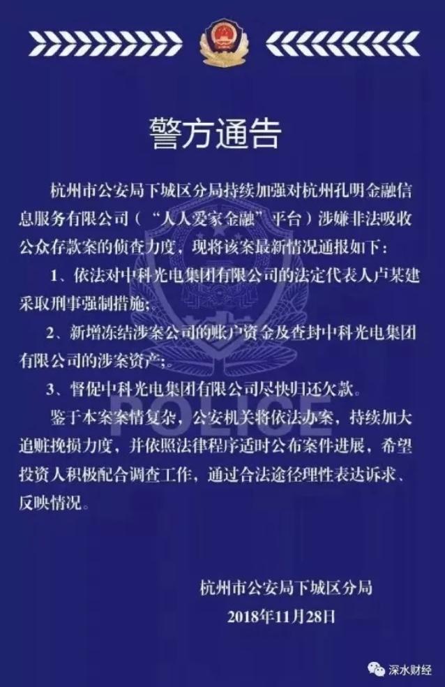 11月28日,杭州公安局下城区分局发布关于人人爱家金融的案情进展通报。根据通报,警方已对中科光电集团有限公司法定代表人卢某建采取刑事强制措施;新增冻结涉案公司账户资金及查封中科光电集团有限公司的涉案资产;督促中科广电集团有限公司尽快归还欠款。