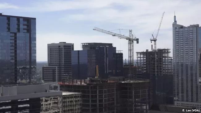奥斯汀市中心的繁忙的施工图景(图片来源:VOA News)