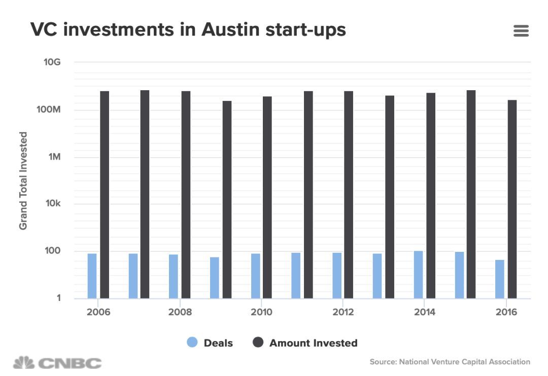 尽管奥斯汀冉冉升起的创业氛围令人称道,但风投数量少、投资氛围不成熟也成为许多创业者诟病的地方。2006~2016年间,奥斯汀地区初创企业的总融资金额在4亿~7亿美金之间浮动,并未有明显增长趋势。