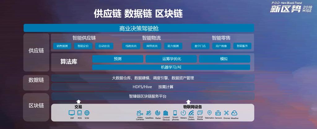 另外一个京东是一个自营电商,它有一个很复杂的供应链网络。目前供应网络是线性的网络有几个缺点,第一就是信息孤岛、信息不流畅、自动化程度低追责难,为了应对这个缺点,我们用区块链来加速我们的供应链的变革。未来的供应链网络是一个高度的网络化和智能化的网络,我举一个例子,京东数以万计的商品里面,一个采销最多管理一百到两百个,这是一个很大的限制。如果这样的话,当所有的人去管理,那将极大的增加成本,网络就要求它有自动化的能力,这自动化能力怎么来做?让区块链在这里面发挥作用?我们看一下这个架构图,首先我们用区块链打造一个可信的价值网络,在这网络基础上设置各种的设备,收集高质量的数据,上面是一些数据层,一个近实时数据分析,最终把分析的结果给我们的算法层,是供应链相应的算法层,最终达到整个的区块链可见信,这时候在整个网络里面既有端到端的可见,就会极大提高了我们的效率。