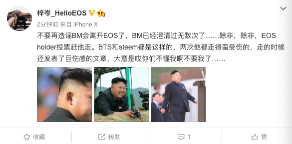 对此,梓岑则在自己的微博上为 BM 鸣不平。他称,BM 在 BTS 及 STEEM的出走实为身不由己,BM多次澄清不会离开,除非EOS holder 投票赶他走。