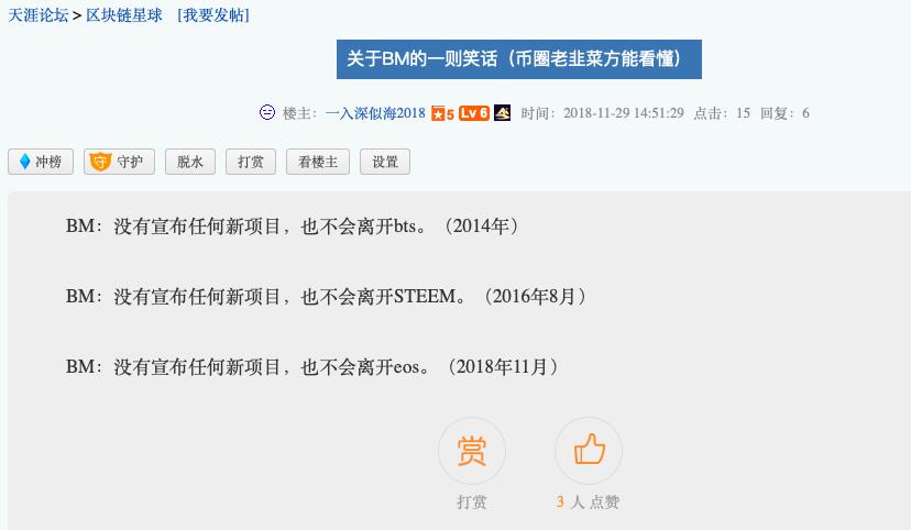 网友调侃称,BM 不过是旧戏重演,EOS此情此景与当时 BTS 及 STEEM的情况几乎无异。