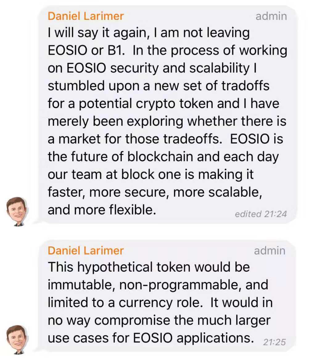 我在此重申:我不会离开 EOS。在处理 EOS 安全性和可扩展性的过程中,我偶然发现了一个对于加密令牌的新想法,(昨天的那些玩笑)我只是在探索是否存在这些权衡的市场。 EOSIO 是区块链的未来,Block.one 团队每天都在使其更快,更安全,更具可扩展性和更灵活。