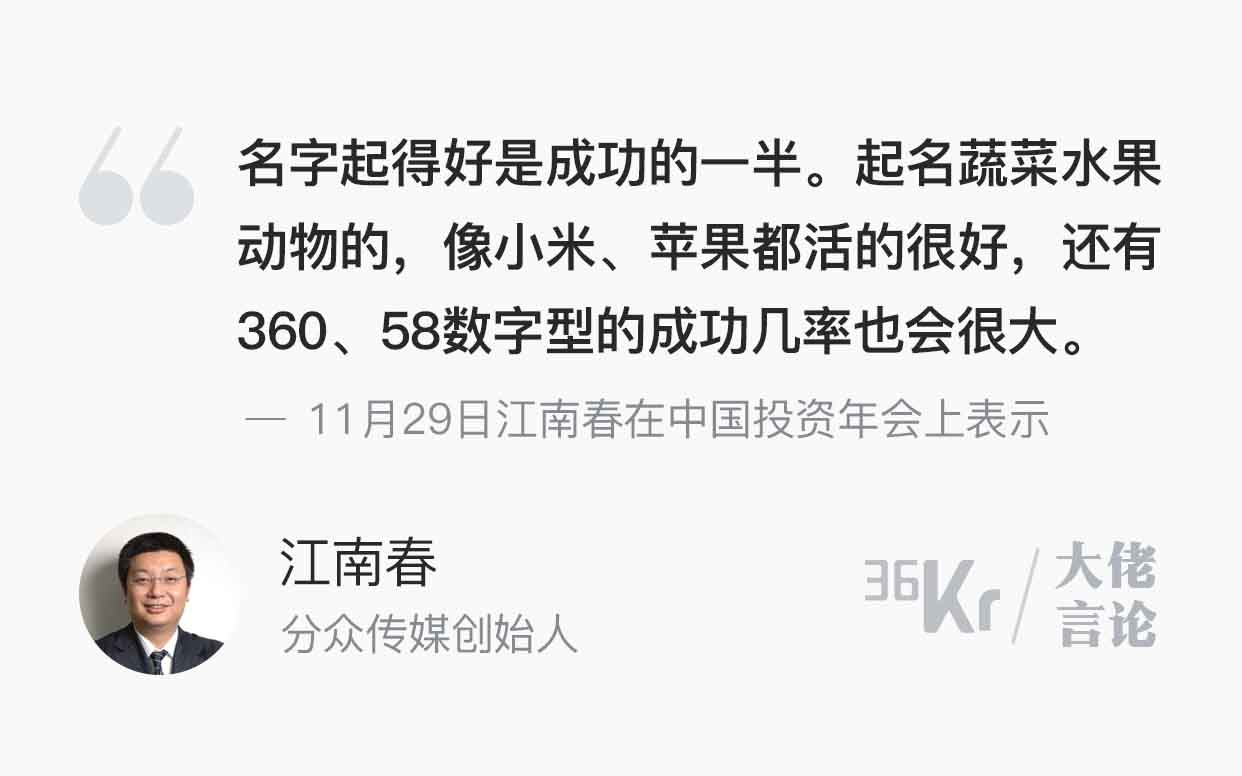 江南春表示,“名字起得好是成功的一半,我如果再商业上有一点成功,主要是妈妈妈妈名字起得好,后天努力根本不重要。所有起名蔬菜水果动物的像小米、苹果手机都生活的很好,还有360、58数字型的有很容易记,成功的几率也会很大。”