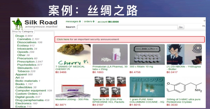 我们可以看到,在这个网站上可以买到毒品、军火、假的证件甚至是假的信用卡等。当然这网站中一般用户不会去选择法币进行交易,我们可以看到它标价都是用比特币进行交易的。这个网站在2013年的时候已经被美国的FBI给关掉了,当时网站管理员被抓的时候,他的电脑里面发现了14万比特币,在开通两年的时间内这个网站为全球的毒品交易提供了超过12亿美金的支付渠道,所以说它是非常恐怖的一件事情。